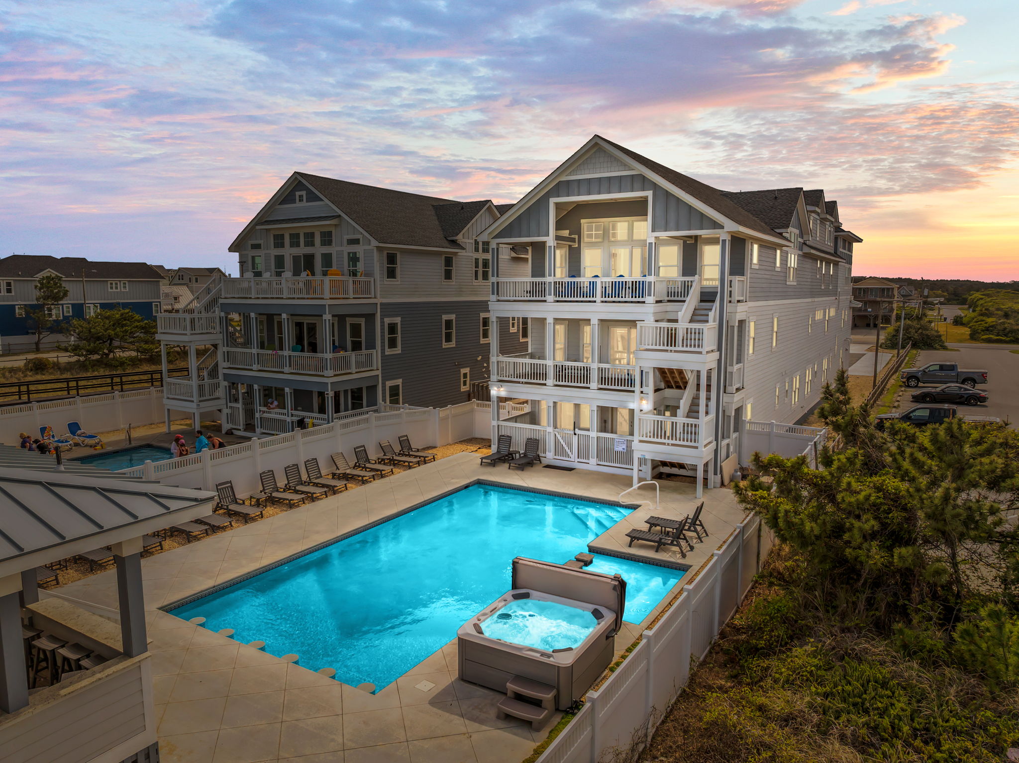 This is Shore To Please—A Luxury Portfolio Asset with Unbelievable Cash Flow. The sprawling four-level estate stands as one of the most impressive and profitable vacation homes on the North Carolina coast, offering 23 luxurious bedroom suites—each with its own private bathroom with custom tiled showers . The main house includes 21 bedrooms, while the separate pool house adds 2 more suites along with a comfortable sitting room with TV and a stacked washer/dryer. The property offers 25 full bathrooms and 3 half bathrooms. With 16 King beds, 6 Queen beds, 2 Queen-over-Queen built-in bunk beds, and 2 sleep sofas, it comfortably accommodates up to 52 guests. A Savaria elevator offers convenient access for guests, groceries and luggage. Interior amenities are designed for both guest enjoyment and operational efficiency. Highlights include a custom wine room with a unique wine barrel table, a large recreation room with a pool table, foosball, shuffleboard, a bar / kitchenette, and multiple TVs. A dedicated cinema room with terraced seating provides an excellent entertainment option. 30 Smart TVs with streaming are available in every bedroom, great room, rec room, theater room, and cabana. Echo Dots are in all bedrooms, supported by eight wireless access points for reliable connectivity. Fully equipped kitchens, six wine chillers, three refrigerators, four dishwashers and a Hoshizaki commercial ice machine add convenience, while the Demand Controller system and tankless water heaters improve energy efficiency and reduce operating costs. Outside, paradise awaits! The centerpiece is a massive 45’ x 21’ heated private pool with a spacious splash deck, perfect for cooling off or lounging in the sun. Two luxurious hot tubs add to the oasis—one on the pool house rooftop party deck offering sweeping ocean views, complemented with chaise loungers a picnic table and stainless cable railing. Multiple covered decks, some with direct bedroom access, plus an elevated dune deck, provide plenty of outdoor living space. Guests enjoy a private dune-top walkway to the beach, two outdoor showers, and multiple gas grills. With more than 22 parking spaces, the estate easily handles large groups. The views of the Atlantic surf are endless!...... Investment Highlights and Cash Flow Potential: What truly sets “Shore To Please” apart is its exceptional performance as a vacation rental investment. This property has consistently generated over $600,000 in gross rental income per year for multiple years, establishing a proven track record of strong revenue. By eliminating owner-use weeks and optimizing the rental calendar, annual gross income has strong potential to exceed $730,000. These figures translate into excellent net cash flow after typical operating expenses, thanks to high occupancy rates driven by its prime oceanfront location, large group capacity, and extensive amenity package. Full financial CASH FLOW ANALYSIS available. The combination of 23 en-suite bedrooms, resort-style amenities, and direct beach access creates year-round demand from large families, corporate groups, and special event guests. Low maintenance requirements, energy-efficient systems, and a turnkey operation further enhance profitability and minimize owner workload. In one of the Outer Banks’ most sought-after rental markets, this home delivers reliable, high—volume cash flow with significant appreciation potential. Shore To Please represents a rare opportunity to acquire a fully furnished, high-performing oceanfront asset with immediate income-generating capabilities. Whether as a primary investment property or part of a larger portfolio, it offers substantial returns through strong rental performance, operational efficiency, and a desirable location that supports consistent bookings and premium nightly rates.This estate provides the perfect balance of luxury accommodations and smart investment value in a premier coastal market. Offering both personal enjoyment and excellent cash flow!